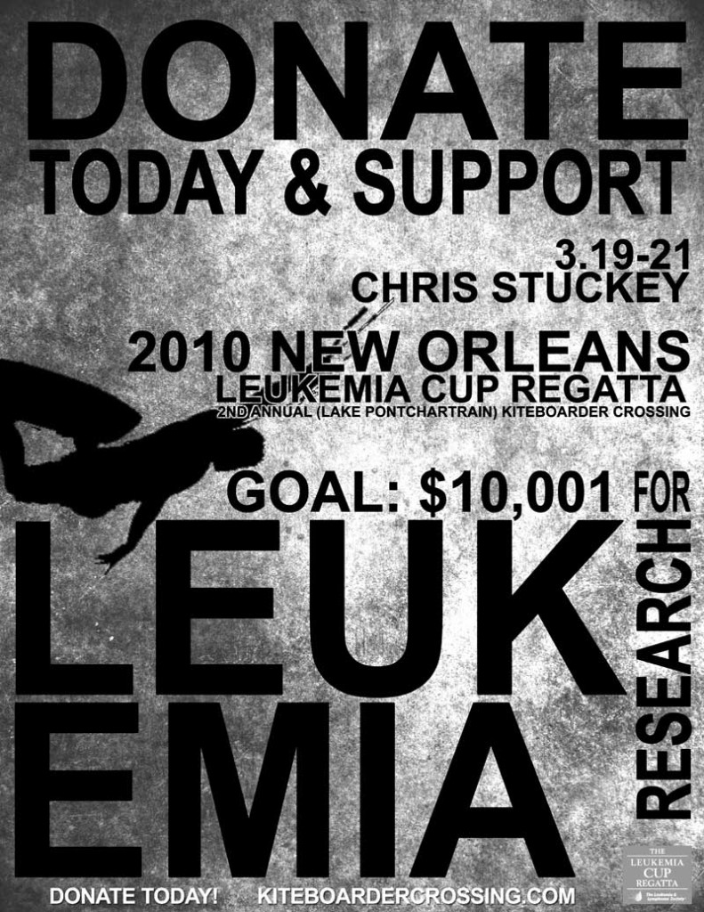 Quick note to head over to my boy Chris Stuckey’s website http://www.thechrisstuckey.com and DONATE for his bid in the 2010 New Orleans Leukemia Cup Regatta. During the window of 3/19 to 3/21 he’ll be attempting to kite across Lake Pontchartrain, a feat he accomplished a little…